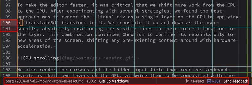 Atom, GitHub’s code editor, is now using React to build the editing experience. They made the move in order to improve performance. By default, React helped them eliminate unnecessary reflows, enabling them to focus on architecting the rendering pipeline in order to minimize repaints by using hardware acceleration. This is a testament to the fact that React’s architecture is perfect for high performant applications.