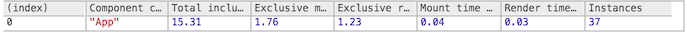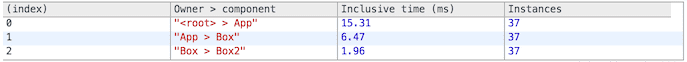 Prints the overall time taken. When no arguments are passed, printInclusive defaults to all the measurements from the last recording. This prints a nicely formatted table in the console, like so: