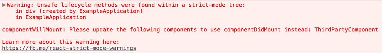 strict モードが有効のとき、React は安全でないライフサイクルを使用した全てのクラス型コンポーネントのリストをまとめあげ、それらのコンポーネントの情報を含む下のような警告のログを出力します。