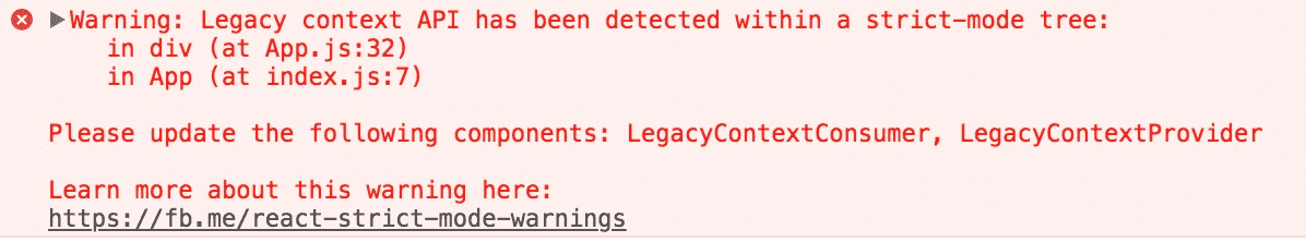 レガシーなコンテクスト API はエラーを起こしがちで、将来のメジャーバージョンで削除予定です。16.x の全てのバージョンでは依然として動きますが、strict モードでは下のような警告文が表示されます。